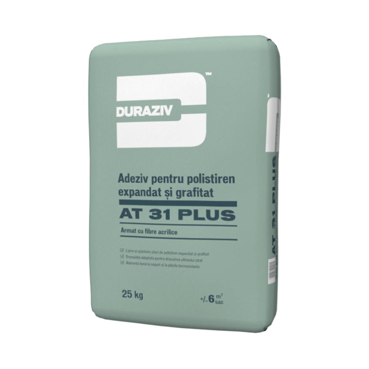 DURAZIV AT 31 PLUS este un adeziv și masă de șpaclu recomandat pentru lipirea şi şpăcluirea plăcilor termoizolante, în cadrul sistemului compozit exterior de termoizolaţie (ETICS) cu plăci de polistiren expandat EPS, alb şi grafitat, cu fixare mixtă adeziv+dibluri.