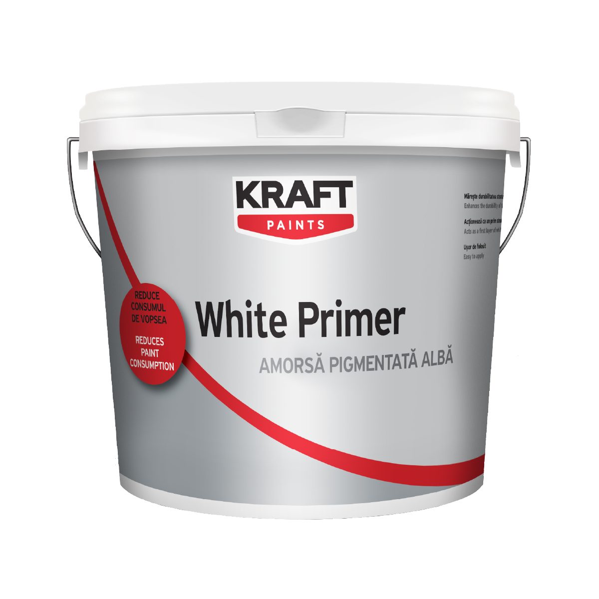 KRAFT White Primer este o amorsă utilizată pentru amorsarea suprafețelor absorbante, în vederea reducerii și reglării capacității lor de absorbției. Deoarece este pigmentată, funcționează și ca prim strat de vopsea diluată necesitând doar un strat de vopsea albă pentru acoperirea totală a suprafeței.