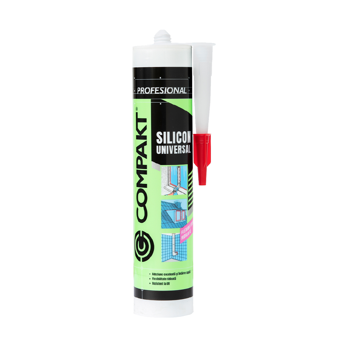COMPAKT® Silicon Universal este un etanșant siliconic monocomponent, cu întărire rapidă, ușor de prelucrat, care în contact cu umiditatea atmosferică formează o peliculă cauciucată foarte rezistentă, cu aderență excelentă la sticlă, ceramică, metale, majoritatea tipurilor de plastic, lemn vopsit. Din cauza acidului acetic eliberat în timpul întăririi, nu este recomandat pentru utilizarea pe substraturi calcaroase precum beton, tencuială, cărămidă.