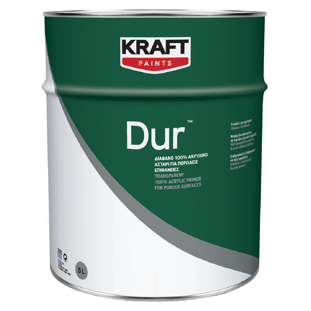 Grund acrilic transparent, pe bază de solvent, pentru suprafețe poroase – KRAFT Dur™ se utilizează pentru reducerea gradului de absorbţie al suprafeţelor exterioare, noi sau vechi, din tencuială, beton, gips-carton, plăci de ciment și altele. Are putere mare de penetrare în porii suprafeței, asigură o aderenţă puternică a stratului de vopsea la suport și stabilizează substraturile de adezivi, chit și vopsea veche.