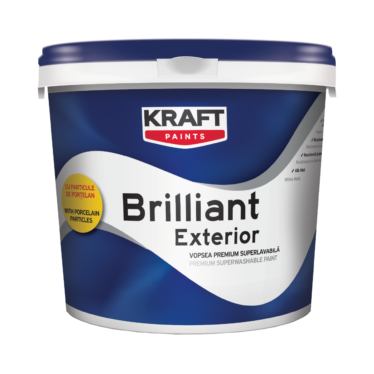 Vopsea pentru exterior, albă, super-lavabilă – KRAFT Brilliant Exterior, fortificată cu particule de porțelan, este destinată decorării și protejării pereților exteriori ai clădirilor rezidențiale și nerezidențiale. Are rezistență mare la intemperii și putere foarte bună de acoperire. Poate fi colorată în sute de nuanțe.