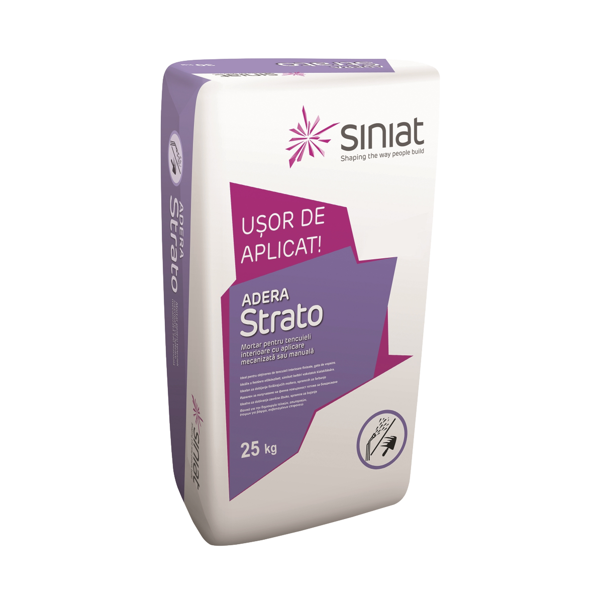 Adera Strato este un mortar unistrat pe baza de ipsos, pentru tencuiri la interior. Produsul este predozat cu aditivi speciali și perlit pentru a constitui un fundament durabil pentru finisarea pereților și un consum redus de material. În combinație cu apa, se formează o pastă omogenă cu timp mare de lucru și lucrabilitate bună. După uscare, formează o suprafață finală de calitatea celor gletuite, de un alb deosebit, gata de vopsit.