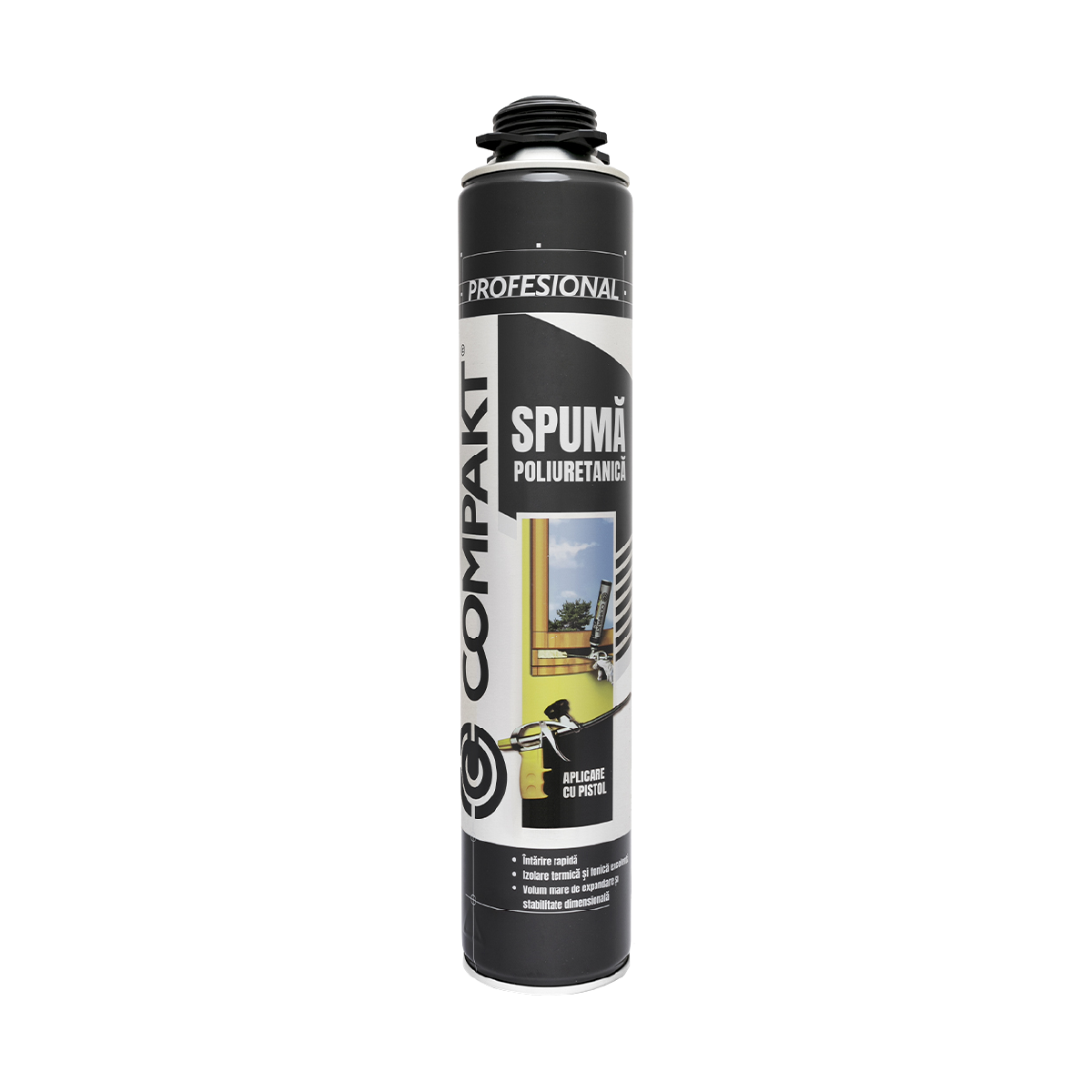 COMPAKT® Spumă poliuretanică se întărește rapid în contact cu umiditatea atmoseferică și are aderență bună la: lemn, cărămidă, beton, ipsos, zidărie, metal, polistiren, PVC dur și poliuretan rigid, azbest, materiale plastice. Spuma are o aderență scăzută la polietilenă, polipropilenă, poliamidă, silicon și teflon. Produsul este disponibil în recipient de 750 ml, pentru aplicare cu pistol.