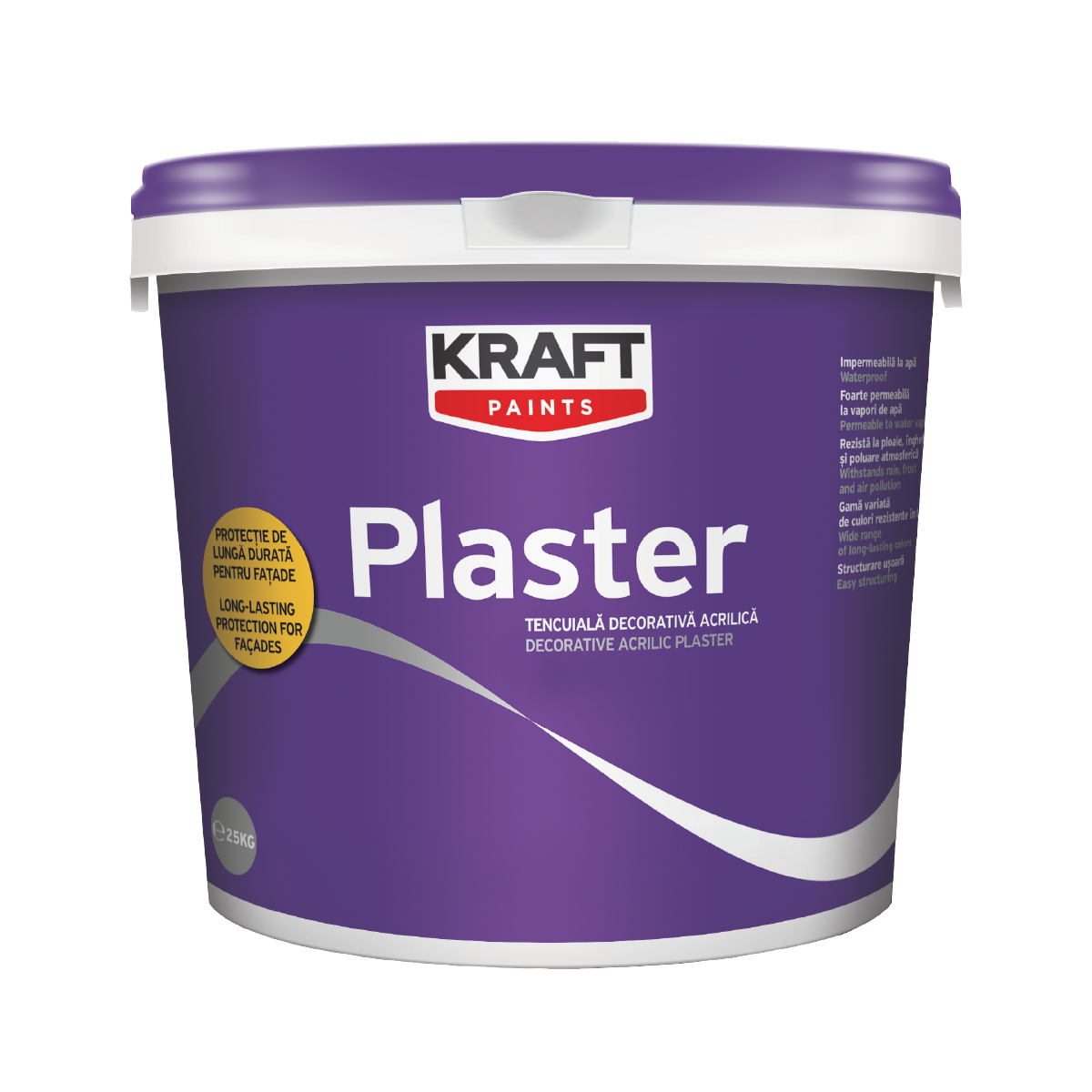 KRAFT Plaster este produsă pe bază de rășini acrilice, agregate minerale cu dimensiuni între 0,25 și 2,5 mm, pigmenți și aditivi, disponibilă în 2 variante de structră: striată (R15, R25) și granulată (K10, K15, K20).
