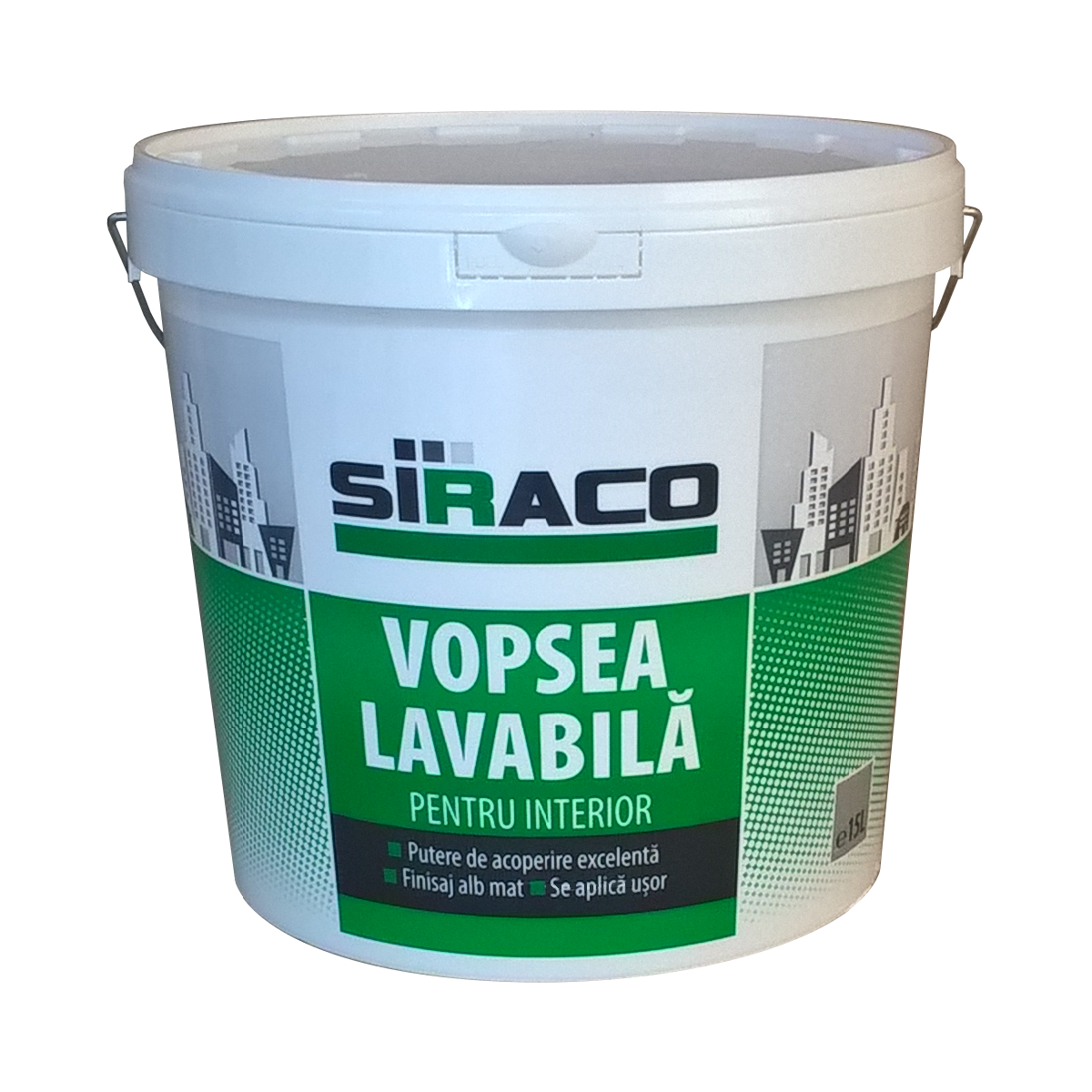 Vopsea lavabilă pentru interior SIRACO a fost concepută special pentru lucrări care necesită volume mari de vopsea albă de bună calitate, cu proprietăți de aplicare (lucrabilitate, timp de uscare, putere de acopeire) care să asigure eficiență.
